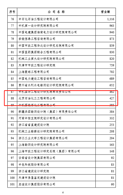 近日,中國勘察設計協會發布了《關于公布勘察設計企業工程項目管理和工程總承包營業額二0二0年排名的通知》,北京石油化工工程有限公司獲工程總承包營業額排名第52位、工程項目管理排名第88位。