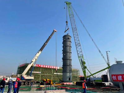 二甲醚反應(yīng)器為二甲醚工段的核心設(shè)備,其將上游來(lái)的物料甲醇經(jīng)二甲醚反應(yīng)器在催化劑作用下脫水制成二甲醚,為裝置主工藝的起點(diǎn),亦為下游羰基化工段提供關(guān)鍵反應(yīng)物料。二甲醚反應(yīng)器總重約90噸,主吊使用260噸履帶吊,300噸汽車(chē)吊溜尾,經(jīng)過(guò)1小時(shí)吊裝,設(shè)備平整就位。