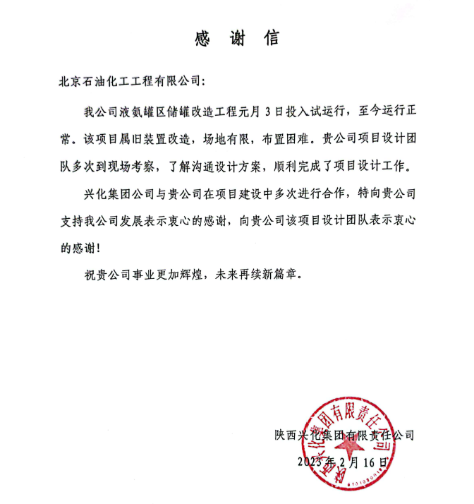 近日,北京石油化工工程有限公司收到陜西興化集團發(fā)來的感謝信,對我公司在負責液氨罐區(qū)儲罐改造工程設計工作期間優(yōu)化設計方案、主動協(xié)調配合,高質量完成建設任務給予了充分肯定。