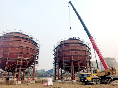 1月9日,由北油工程總承包的德普新材料產業園項目兩臺1500立方米二氧化碳球罐提前3天封頂。截止目前,現場26臺儲罐基礎、中心化驗室、中控室、綜合維修廠房以及變電所等建構筑物主體全部完成。