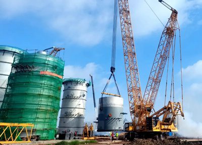 目前,DMC裝置主框架鋼結(jié)構(gòu)開始安裝,同時一塔、三塔下段裙座已吊裝就位。兩塔直徑均為8米,高度分別為66.08米和66.7米,重量為455噸和411噸,此次吊裝采用600噸履帶吊,分四段制造及四段吊裝。 為確保順利吊裝,業(yè)主、監(jiān)理、總包、施工單位召開多次吊裝專題會,結(jié)合場地實際情況,研討制定吊裝方案,嚴格按照操作要求進行施工。在各方人員密切配合下,高質(zhì)量完成了本次吊裝任務。